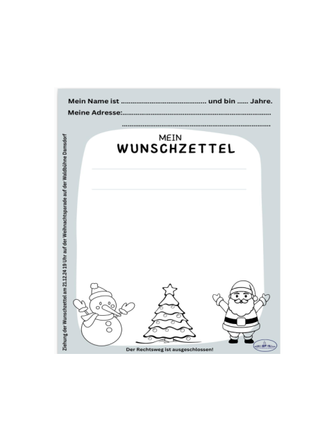 In diesem Jahr habt ihr wieder die Möglichkeit, einen Wunschzettel an den Damsdorfer Weihnachtsmann zu schreiben oder malen. Auf der Veranstaltung der Weihnachtsparade Damsdorf werden dann 5 Wunschzettel gezogen, die gezogenen Kinder (müssen auf der Veranstaltung vor Ort sein) bekommen ein Geschenk. ALLE eingesendeten Wunschzettel werden persönlich vom Damsdorfer Weihnachtsmann beantwortet.
